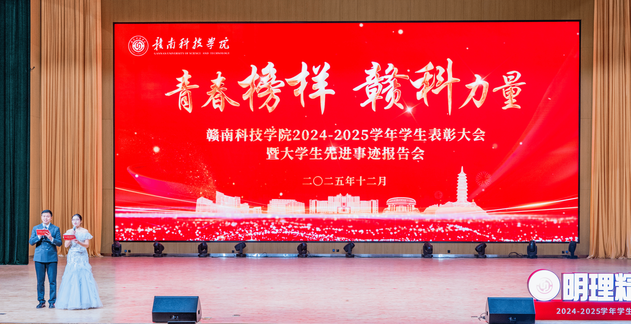 12月26日下午,我校“青春榜样 赣科力量”2024—2025学年学生表彰大会暨大学生先进事迹报告会在大学生活动中心大礼堂举行。学校党委书记邱建军,党委副书记、校长邱建丁,党委委员、纪委书记陈文新,党委委员、副校长何锦龙,党委委员、宣传部部长邓亦林出席会议,各职能部门负责人,各二级学院党委负责人,全体辅导员,受表彰学生以及各学院学生代表共计1000余人参加会议。