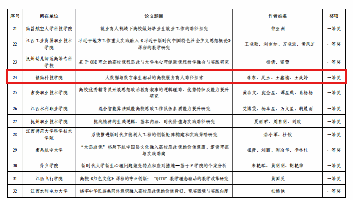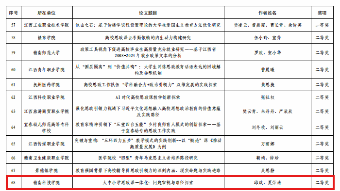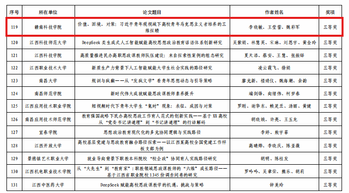 本网讯:近日,江西省教育厅公布《关于2025年度全省高校思想政治工作优秀论文和优秀案例征集活动结果的公示》,经学校推荐、专家评审,我校李东、吴玉、王鑫楠、王奕婷撰写的《大数据与数字孪生驱动的高校服务育人路径探索》获优秀论文一等奖;邱斌、夏荣涛撰写的《大中小学思政课一体化:问题审视与路径探索》获优秀论文二等奖;李晓敏、王莹蓥、魏彩军撰写的《价值、困境、对策:习近平青年观视域下高校青年马克思主义者培养的三维探赜》获优秀论文三等奖;杨瑞撰写的《从“经济贫困”到“职业自信”:高校辅导员就业帮扶的破局之路》获优秀工作案例二等奖,充分展现了我校教师扎实的科学素养和深厚的理论积淀。