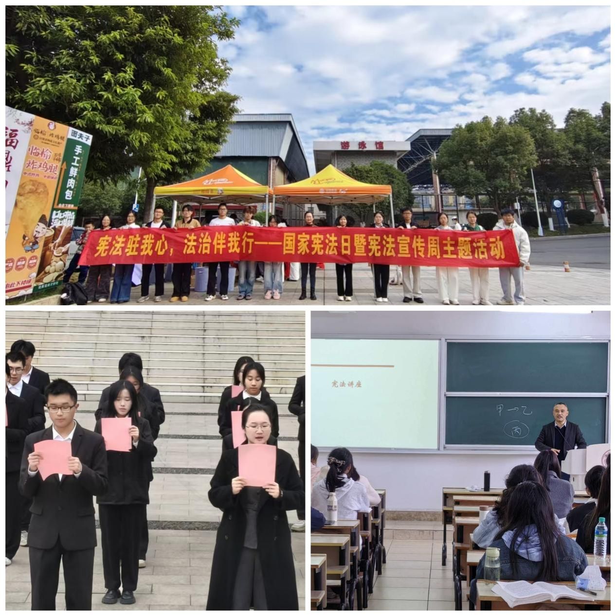 校内活动形式多样且成效显著。12月2日,普法社在馨香园门口设互动展区,通过“普法飞行棋”“宪法知识速答”等趣味游戏,让同学们在寓教于乐中普及宪法知识、提升法治素养;12月4日,在指导老师刘翛然带领下,师生于主教学楼前开展宪法晨读活动,在诵读中感悟宪法庄严,强化尊宪守法自觉;同日,法学教师龚云辉受邀开展宪法主题宣讲,系统阐释宪法核心地位与基本原则,助力师生夯实法治信仰理论根基。