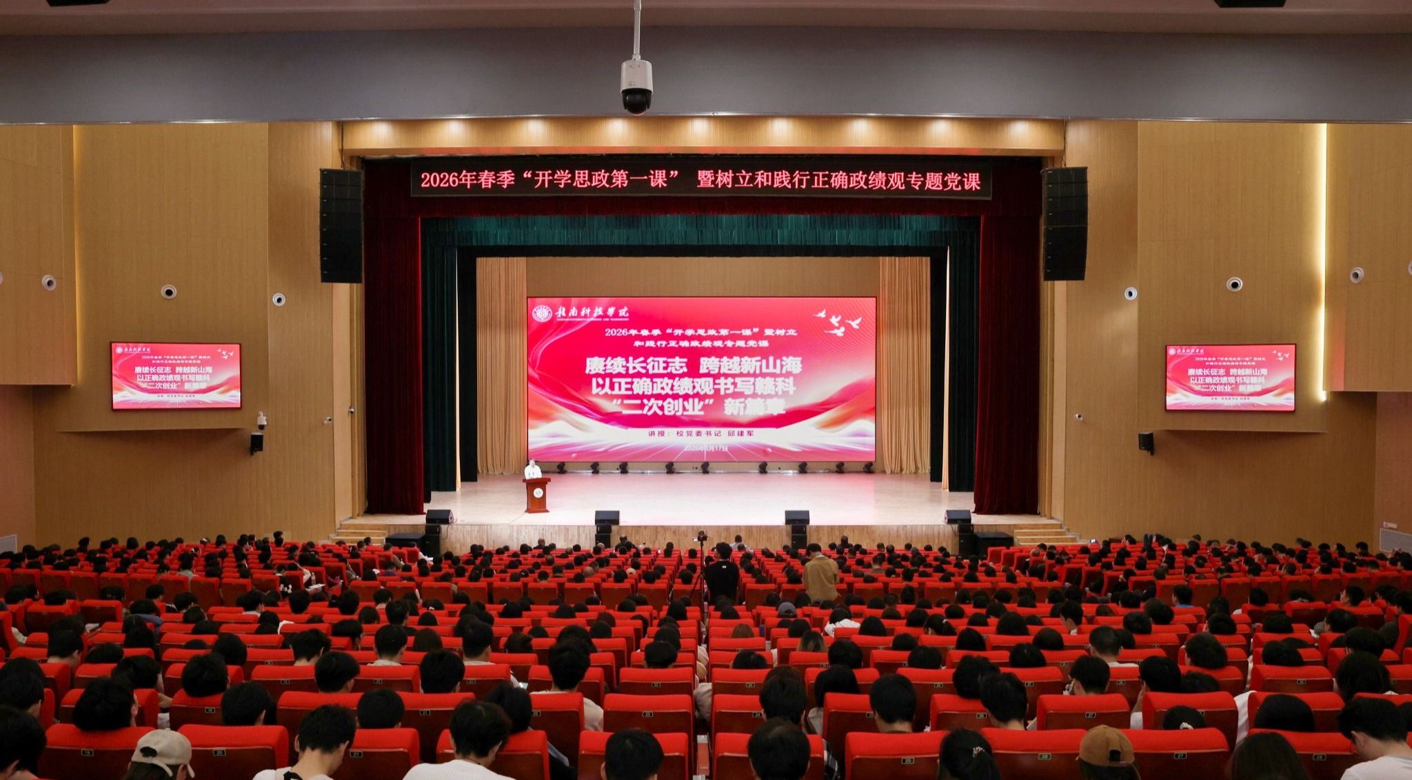 3月17日,校党委书记邱建军以“赓续长征志 跨越新山海——以正确政绩观书写赣科‘二次创业’新篇章”为主题,在大学生活动中心礼堂为全校师生讲授春季“开学思政第一课”暨树立和践行正确政绩观专题党课。本次党课由校党委副书记、校长邱建丁主持。在家校领导、党委委员,副科及以上干部、博士、副高及以上职称教师、专职辅导员、思政课专职教师及各学院学生代表现场聆听。